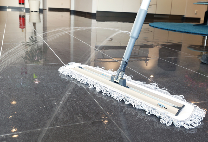 Skru av toppen av skaftet, fyll beholderen med vann, spray flekken og tørk av med moppen. Sprayfunksjonen styres fra håndtaket – bare trykk lett på den blå knappen til du får ut ønsket mengde væske. Laget av aluminium med robuste plastdeler. Lengde 140 cm.