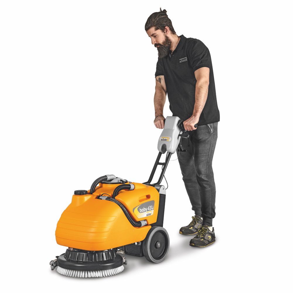 Den store tankkapasiteten kombinert med maskinens små dimensjoner gjør at Adiatek Baby 43 kan arbeide i små miljøer med langvarig autonomi. Oppsamlingstanken kan tømmes med den spesielle dreneringsslangen.