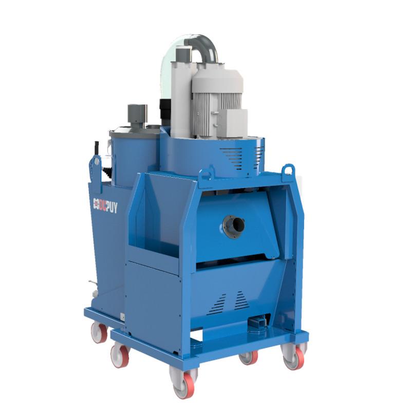 DUPUY CHIPVAC 400 har stor kapasitet med mulighet for å legge til (valgfritt) et metall sikt gitter for olje og flis. Mulighet for å snu opp ned -50° ved hjelp av gaffeltruck med enkelt og effektivt patentert system.