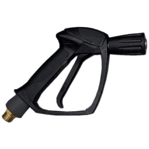 Ny standard pistol for alle PW-H61/101 høytrykksvaskere med messingsvivel mot slange for å forhindre slangevridning. Pistolen har smidd messingkropp med kontaktdeler i rustfritt stål og keramiske kule med høy motstand mot kjemikalier og klor, gjør at pistolen har høy holdbarhet. Low Activation Trigger og komfortabelt grep gir letthet når du jobber lange timer i tillegg til støtsikker kapsling.