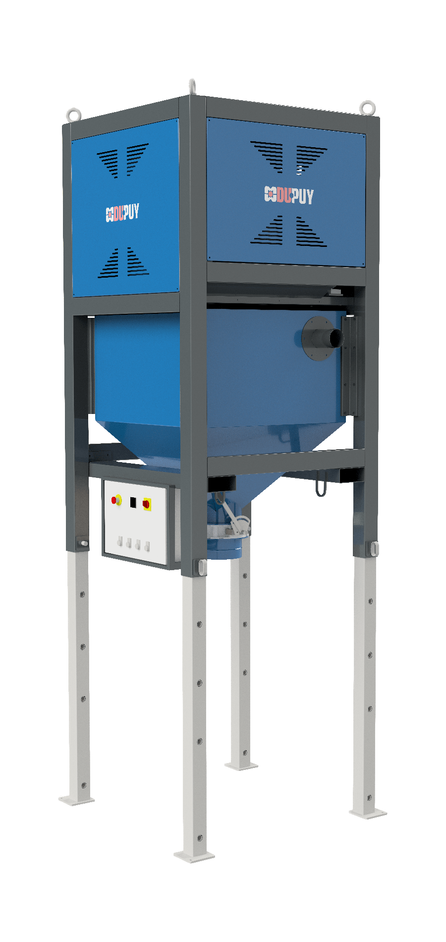 Det sugede materialet slippes lett ut i en trommel eller i en BIG-BAG for å optimalisere produksjonstiden og for å unngå spredning av støv i luften.